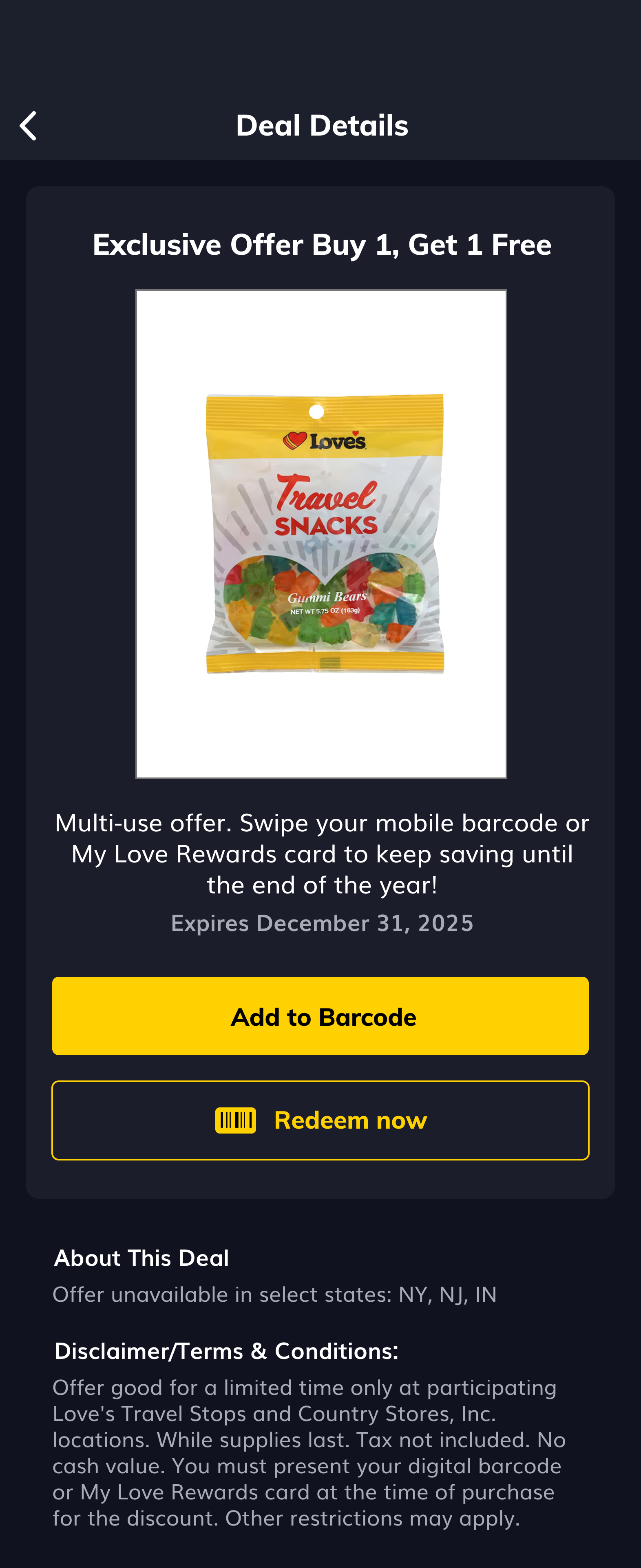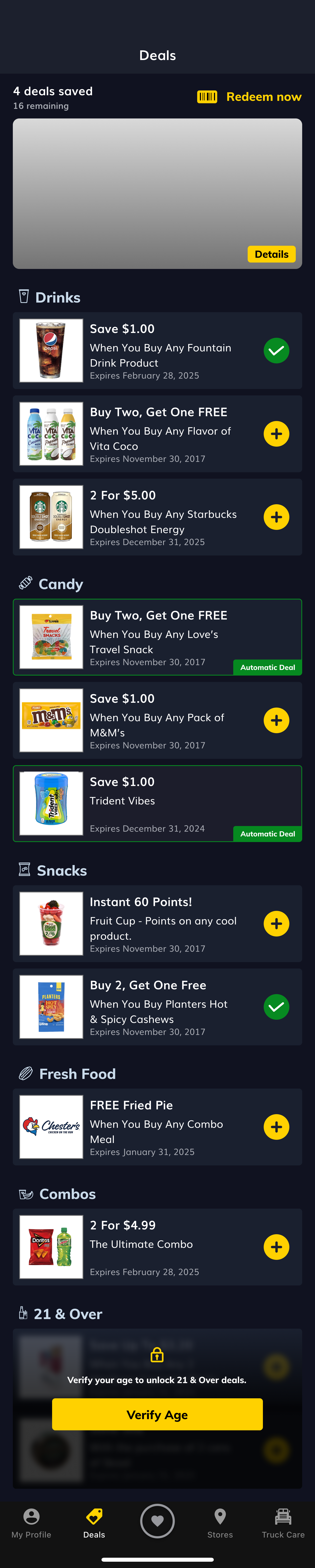 The redesigned Deals page shipped as part of the v.15 release and is live across Love's Connect's 6.1M+ user base. The card system, category structure, age verification flow, and externally-sourced deal type are all in active production.