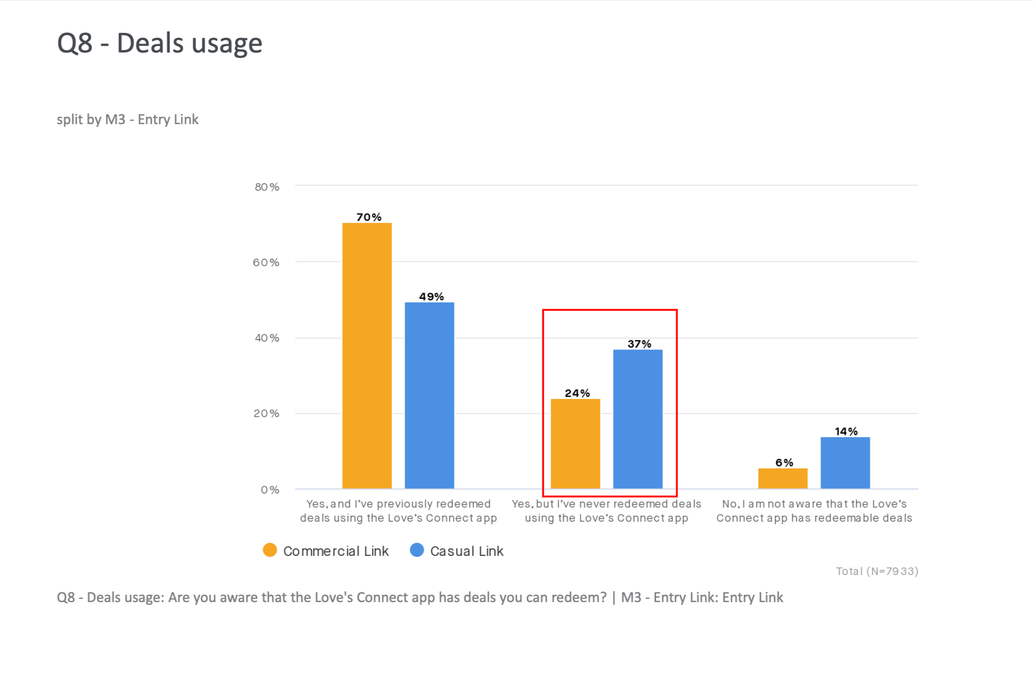 Both segments grew in absolute redemptions. Casual users added 50,000+ redemptions period over period, while Commercial users added over 310,000, a signal that the redesign particularly resonated with the higher frequency commercial segment that the research had identified as under-leveraged on deal engagement.
